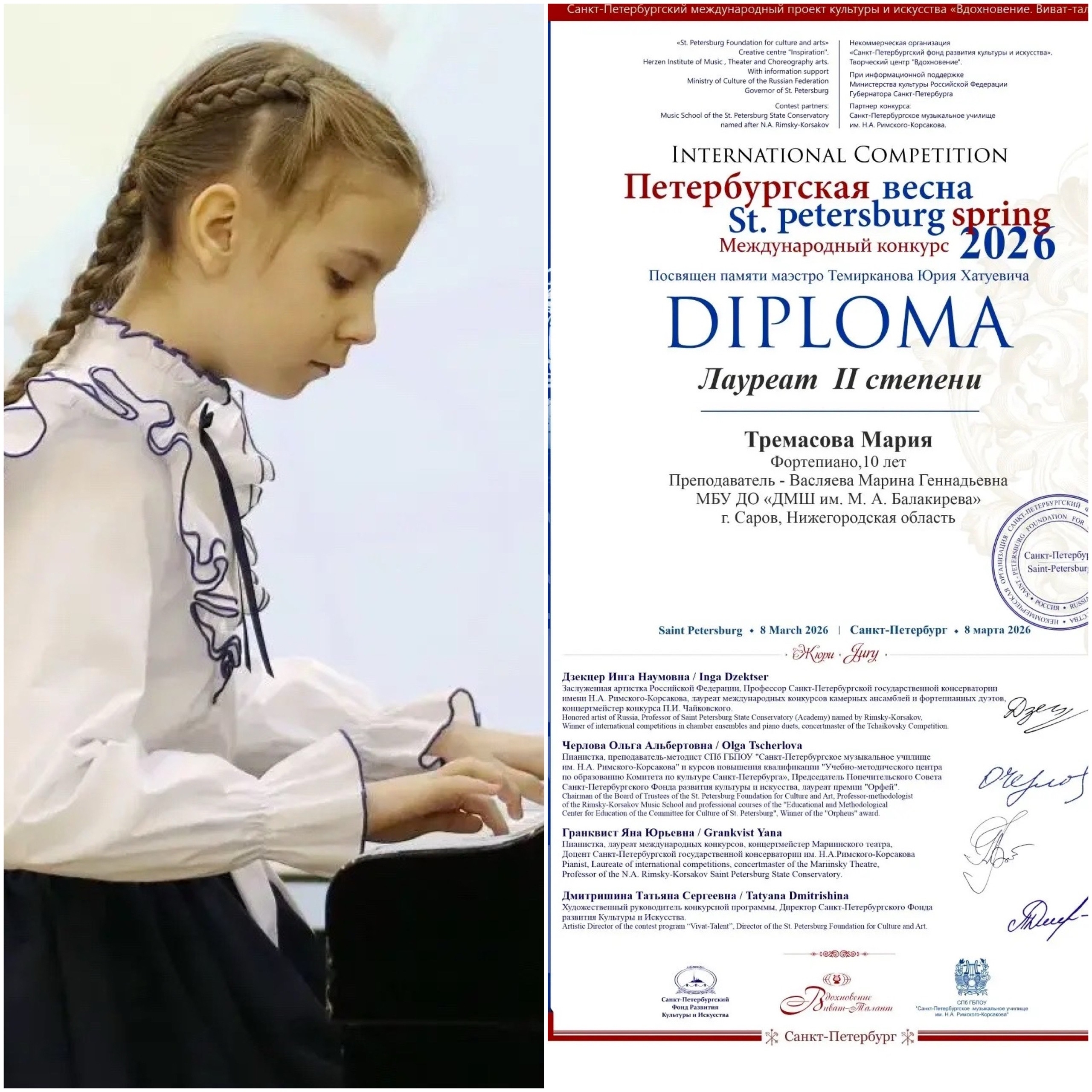 Поздравляем Марию Тремасову, класс преподавателя М.Г.Васляевой, с успешным выступлением на XXIII Международном форуме-конкурсе исполнительского мастерства «Петербургская весна», посвященному памяти маэстро Юрия Темирканова.